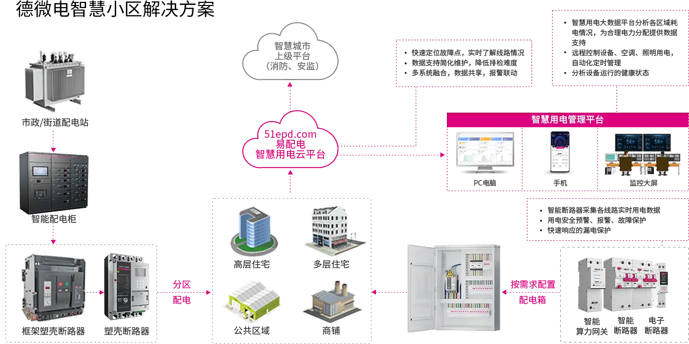 德微电智慧用电安全解决方案通过智能断路器、智能配电柜以及易配电用电运管云平台等产品,为客户定制化配电方案,实现能源精准计量、设备预警告警、漏电自检等用电综合化管控,以数字化管理手段让配电更容易,用电更安全。